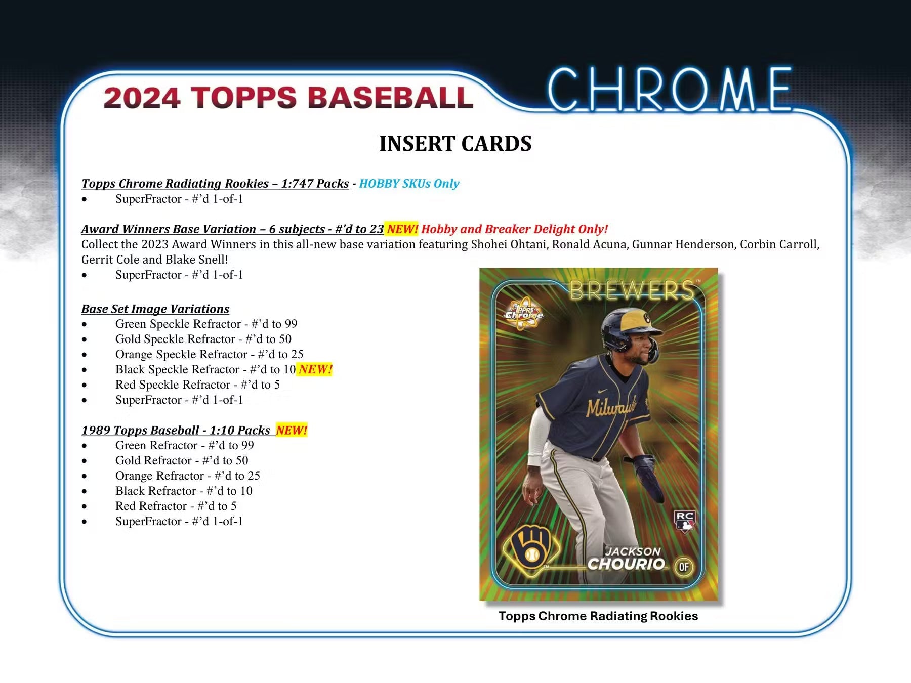Look for Chrome Rookie Autographs from the top 2024 MLB Rookies, including Elly De La Cruz, Jackson Chourio, Wyatt Langford, Ceddanne Rafaela, and Jackson Merrill!