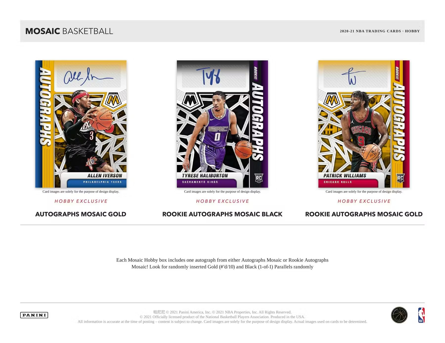AUTOGRAPHS MOSAIC GOLD/ROOKIE AUTOGRAPHS MOSAIC BLACK/ROOKIE AUTOGRAPHS MOSAIC GOLD: Each Mosaic Hobby box includes one autograph from either Autographs Mosaic or Rookie Autographs Mosaic! Look for randomly inserted Gold (#'d/10) and Black (1-of-1) Parallels randomly