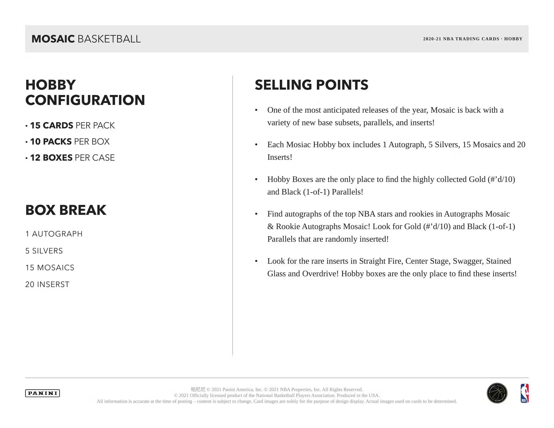 Each Mosaic Hobby box includes 1 Autograph, 5 Silvers, 15 Mosaics and 20 Inserts!