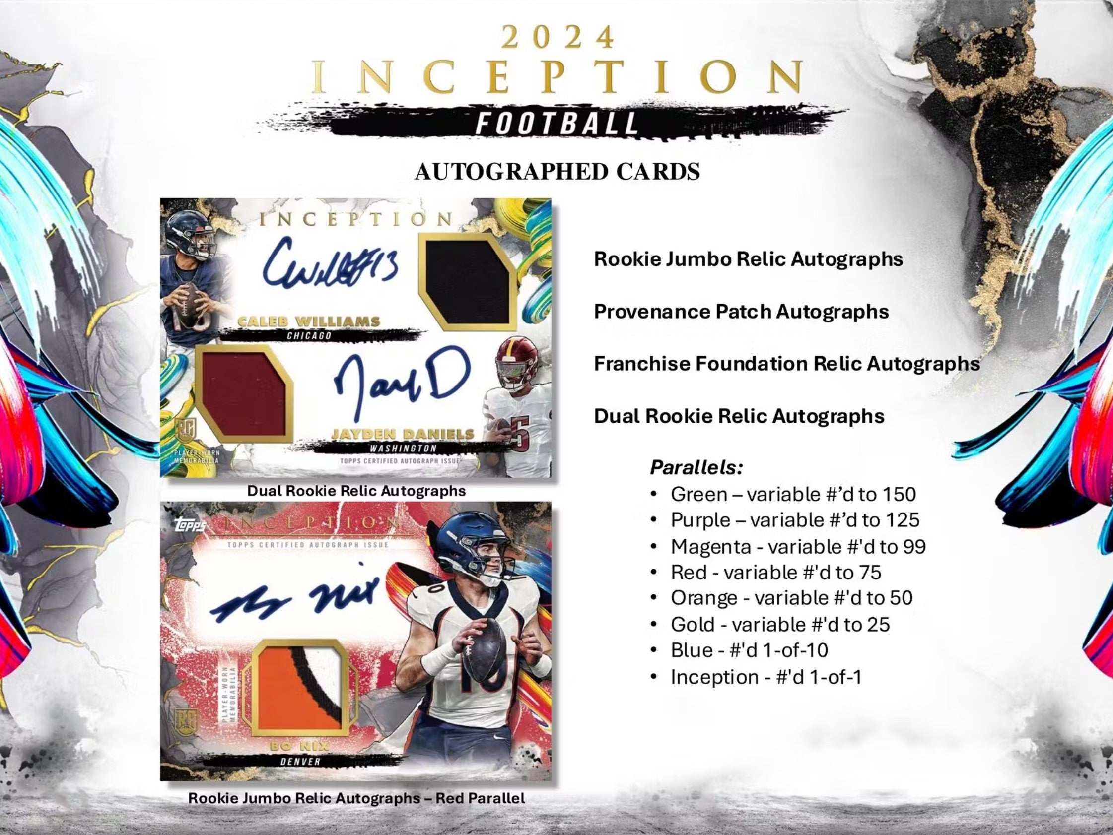 2024 Topps Inception Football is debuting with a lineup of features some of the best rookie patch content Topps' portfolio offers. Collectors can find Rookie Relics such as Rookie Jumbo Relic Autos, Franchise Foundation Relic Autographs, Dual Relic Autographs, and many more!