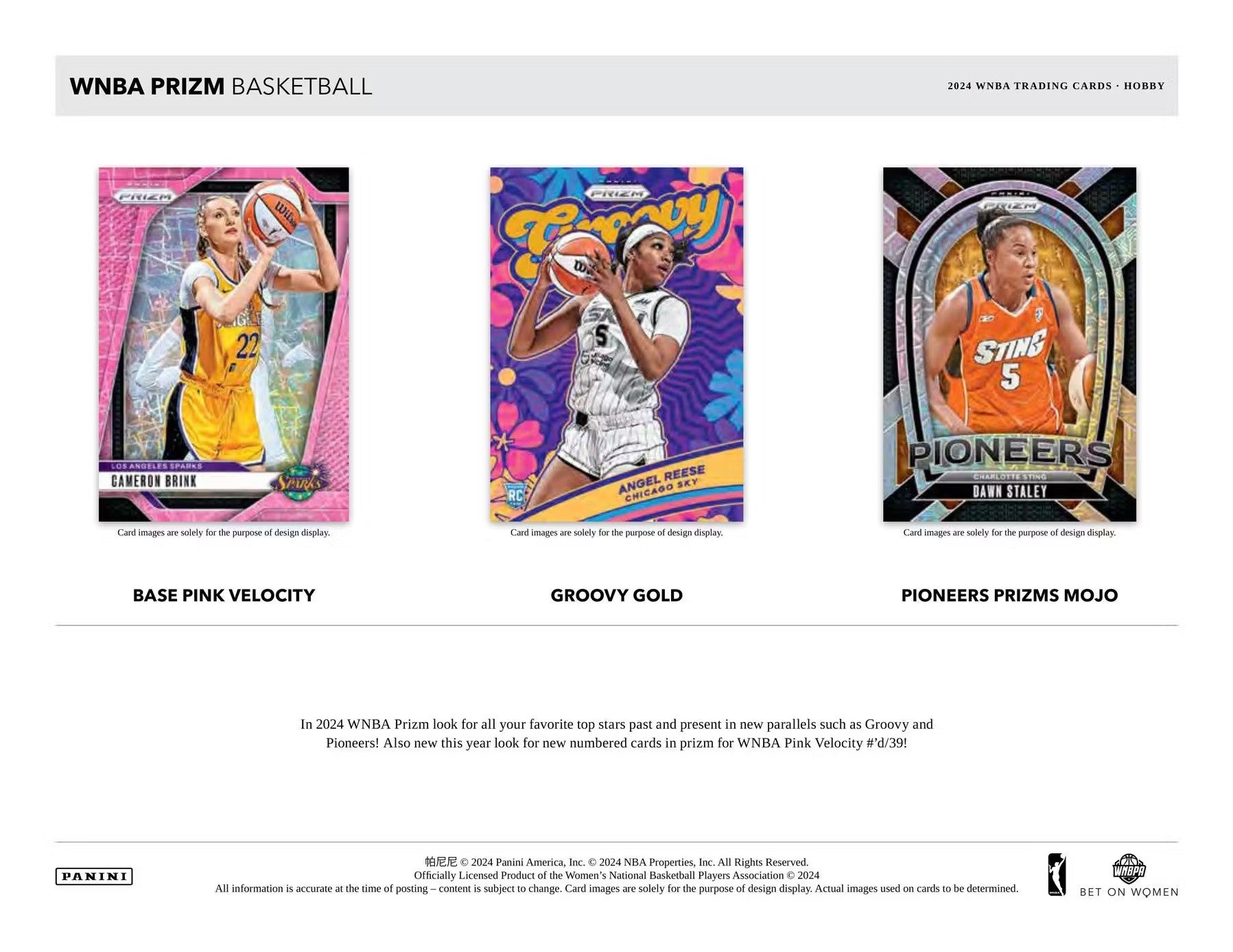 In 2024 WNBA Prizm look for all your favorite top stars past and present in new parallels such as Groovy and Pioneers! Also new this year look for new numbered cards in prizm for WNBA Pink Velocity #'d/39!