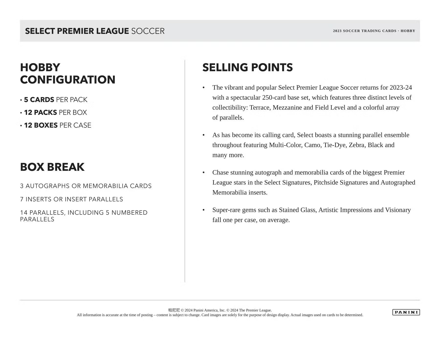 The vibrant and popular Select Premier League Soccer returns for 2023-24 with a spectacular 250-card base set, which features three distinct levels of collectibility: Terrace, Mezzanine and Field Level and a colorful array of parallels.
