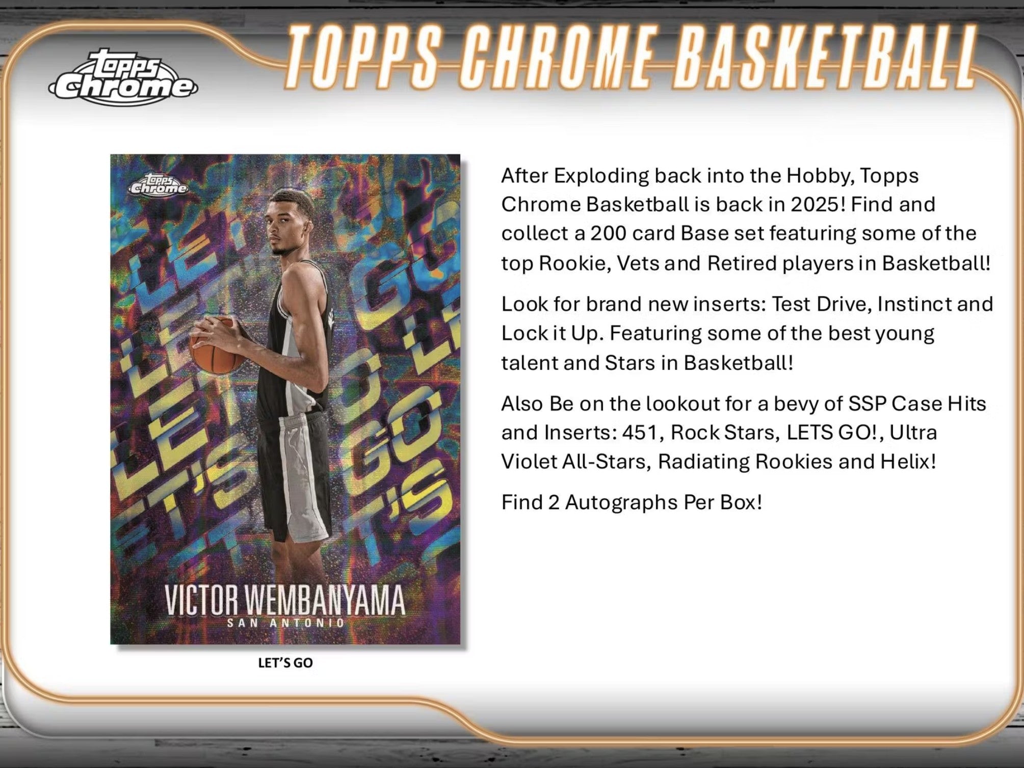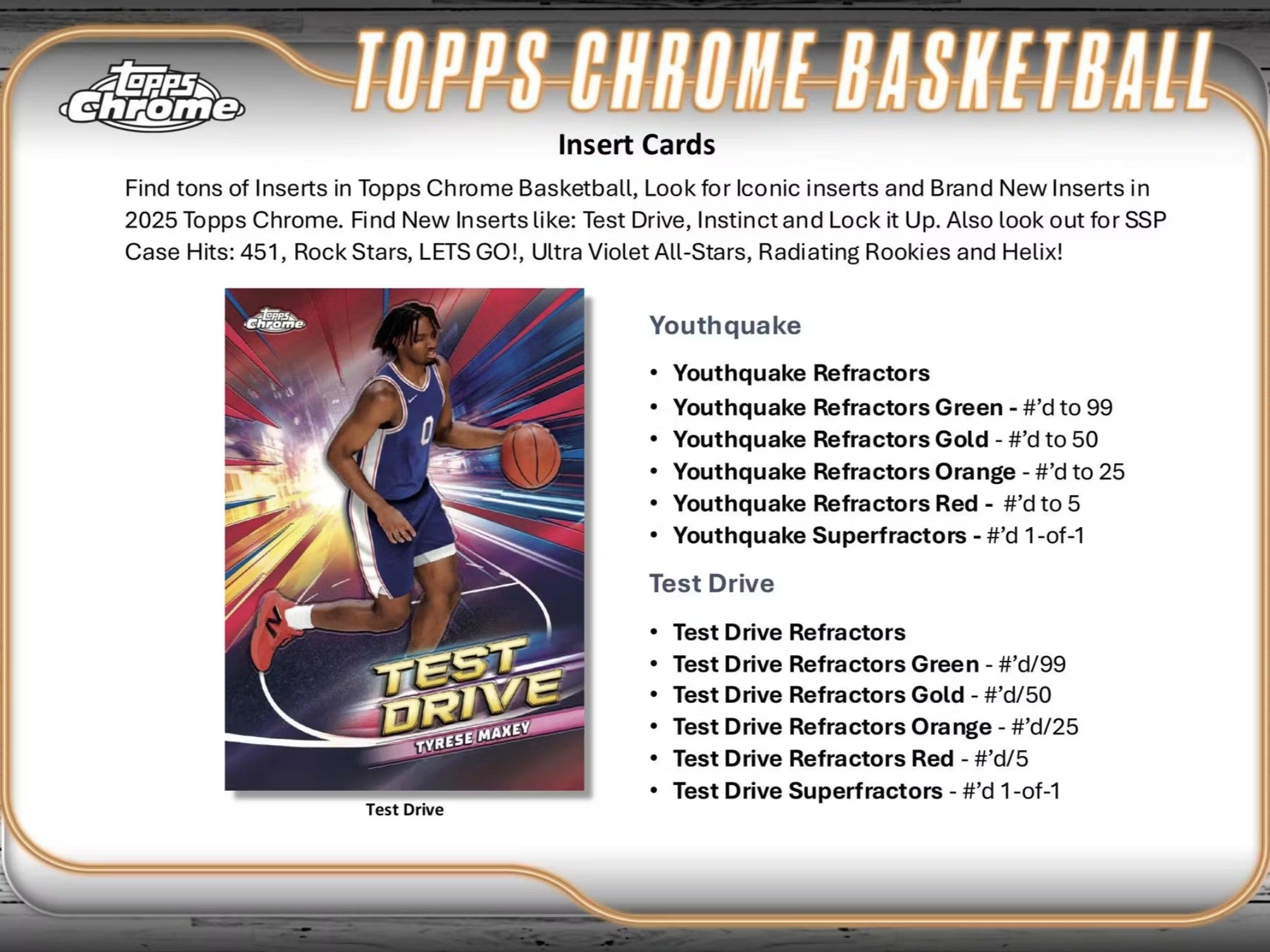 Find tons of Inserts in Topps Chrome Basketball, Look for Iconic inserts and Brand New Inserts in 2025 Topps Chrome. Find New Inserts like: Test Drive, Instinct and Lock it Up. Also look out for SSP Case Hits: 451, Rock Stars, LETS GO!, Ultra Violet All-Stars, Radiating Rookies and Helix!