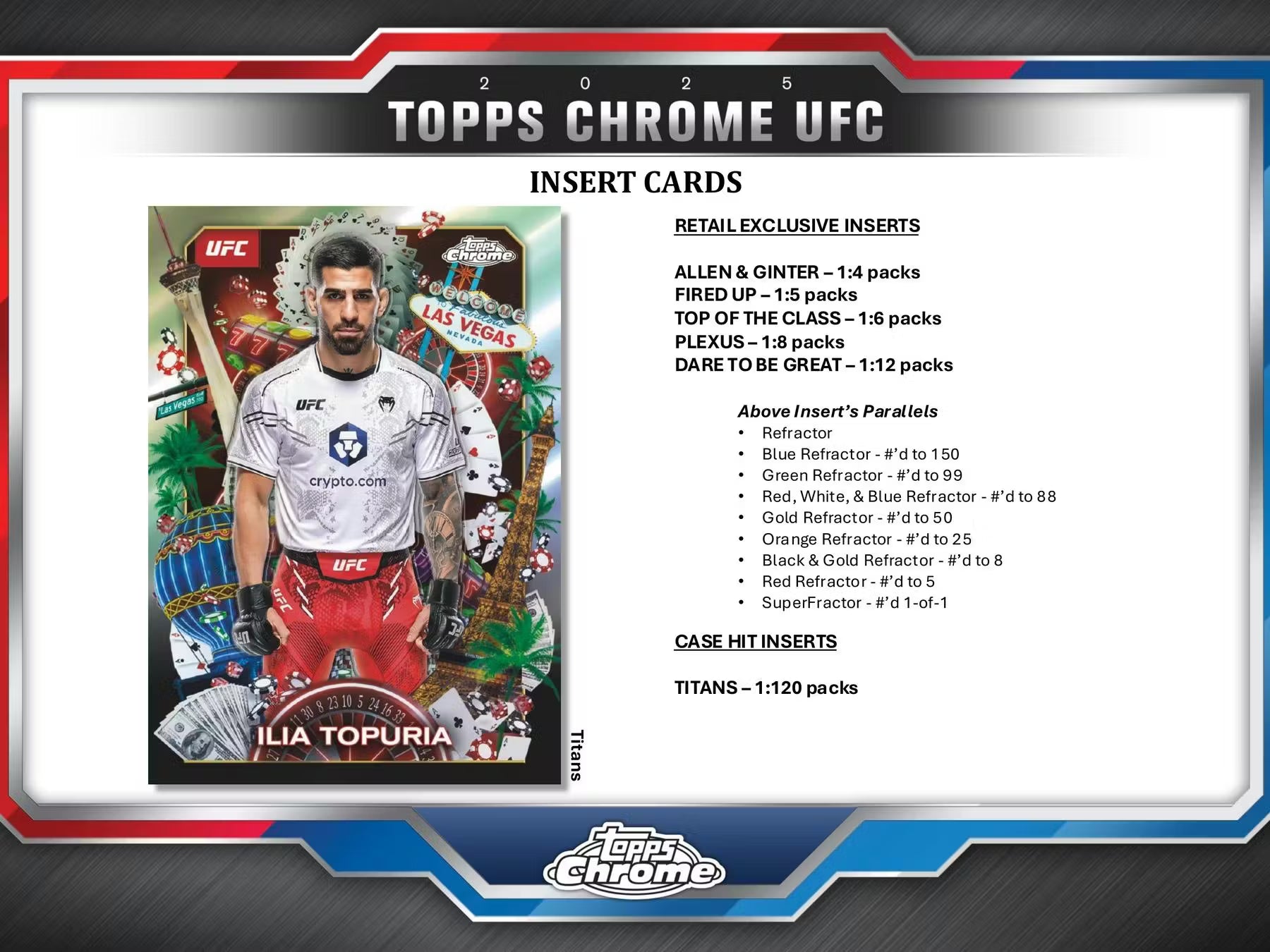 Topps Chrome UFC is back for another year featuring the top fighters to embrace the Octagon. Experience the high-octane action from pack to pack, featuring a wide plethora of autographs, inserts, refractors and new case hit inserts!