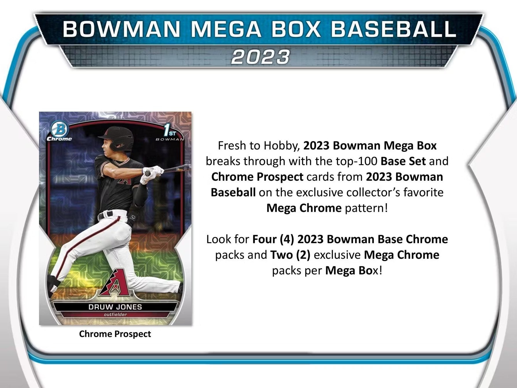 Fresh to Hobby, 2023 Bowman Mega Box breaks through with the top-100 Base Set and Chrome Prospect cards from 2023 Bowman Baseball on the exclusive collector's favorite Mega Chrome pattern!