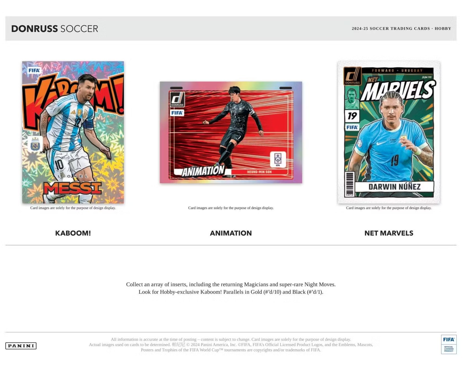 Donruss Soccer is home to the stunning Kaboom! insert. Look for this and the super-rare Night Moves, along with new addition Animation in 2024-25. The insert lineup brings eye-catchers like Net Marvels, Animation, and Rookie Kings among 8 different insert sets.