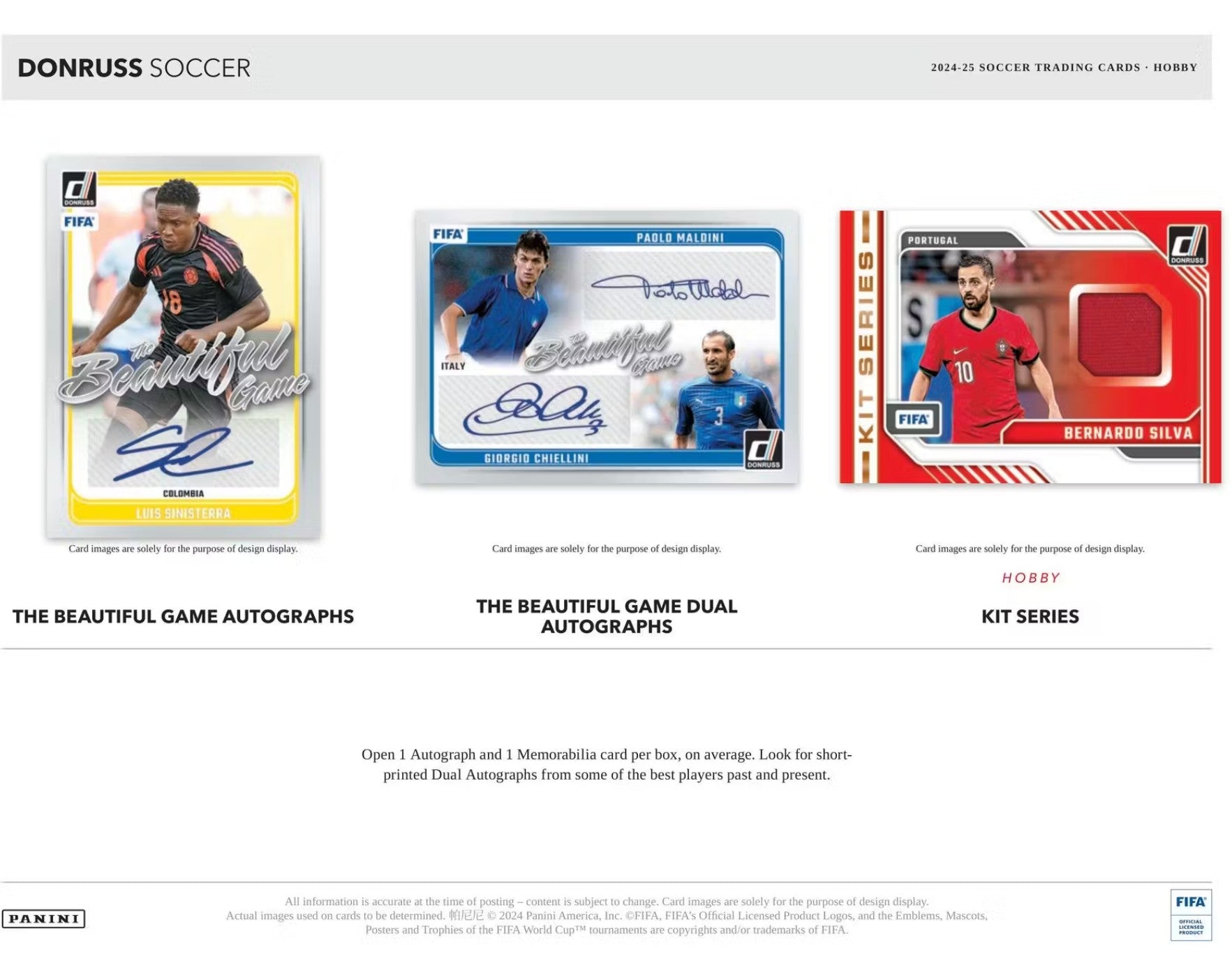 Collect 3 Autograph Inserts (Signature Series, The Beautiful Games Autographs, The Beautiful Game Dual Autographs) and 2 Memorabilia Inserts (Kit Kings, Kit Series).