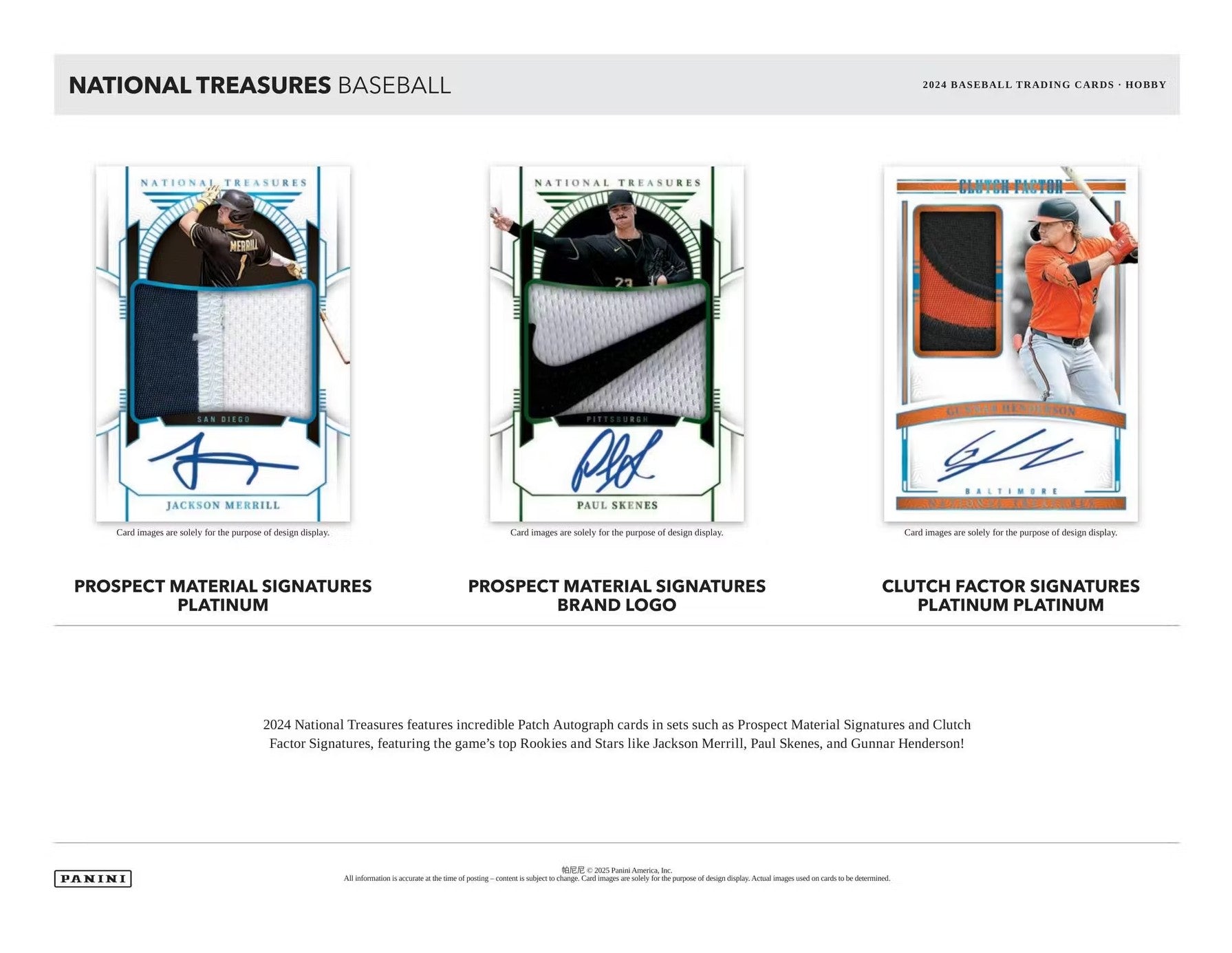2024 National Treasures features incredible Patch Autograph cards in sets such as Prospect Material Signatures and Clutch Factor Signatures, featuring the game's top Rookies and Stars like Jackson Merrill, Paul Skenes, and Gunnar Henderson!