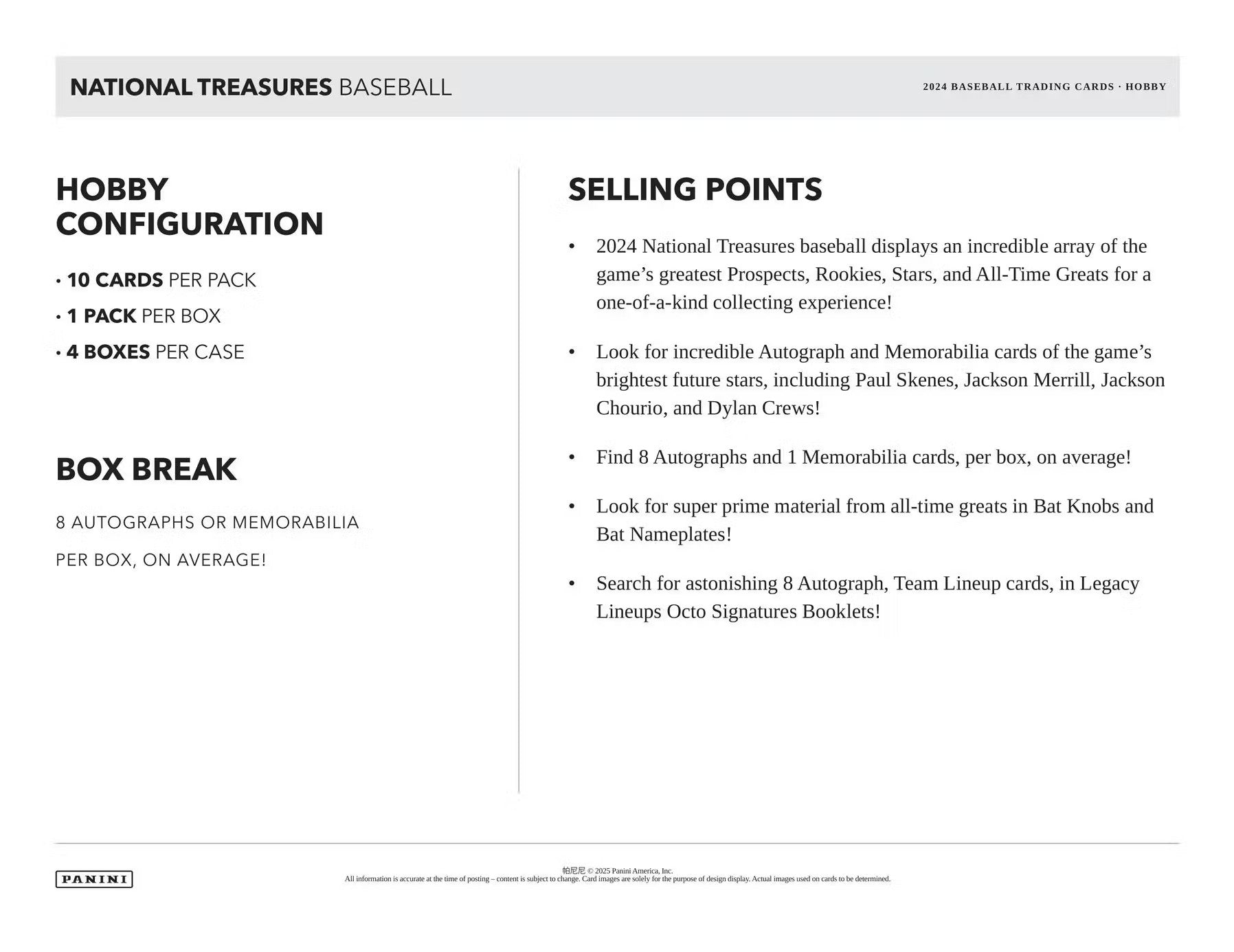 2024 National Treasures baseball displays an incredible array of the game's greatest Prospects, Rookies, Stars, and All-Time Greats for a one-of-a-kind collecting experience!