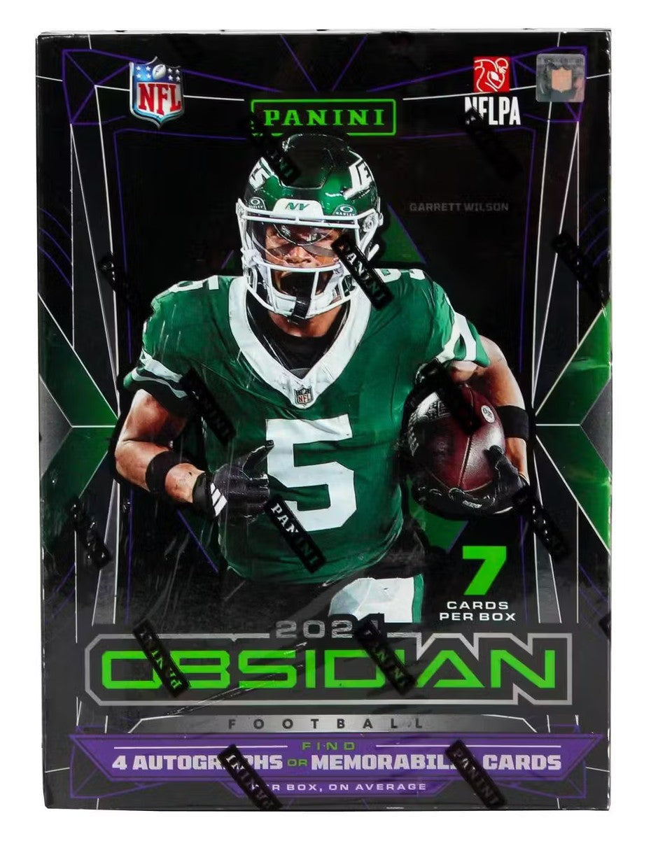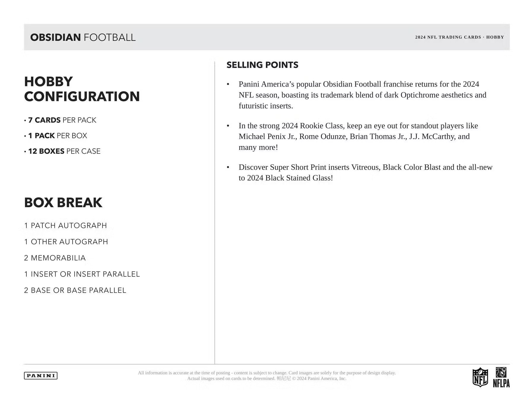 Panini America's popular Obsidian Football franchise returns for the 2024 NFL season, boasting its trademark blend of dark Optichrome aesthetics and futuristic inserts.